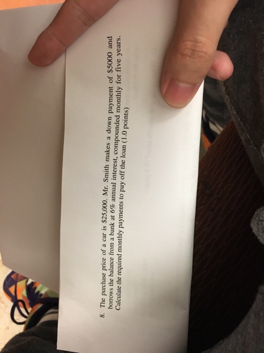 What is her monthly payment if she makes the first payment one month after the purchase? On September 1, 2000, Susan Chao bought a motorcycle for $10,000. She paid $1,000 down and financed the balance with a five-year loan at a stated annual interest rate of 9.6 percent, compounded monthly. ... Read Content